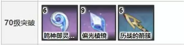 70级:鸣神御灵的亲爱*6、偏光棱镜*9、历战的箭簇*6、摩拉*3.5万