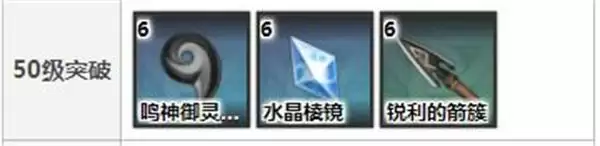 50级:鸣神御灵的欢喜*6、水晶棱镜*6、锐利的箭簇*6、摩拉*2万