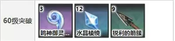 60级:鸣神御灵的亲爱*3、水晶棱镜*12、锐利的箭簇*9、摩拉*3万