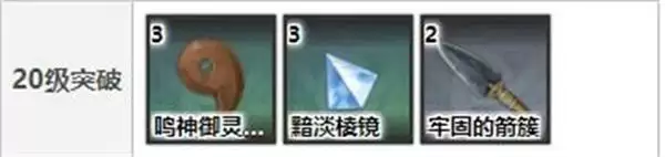 20级:鸣神御灵的明惠*3、黯淡棱镜*3、牢固的箭簇*2、摩拉*0.5万