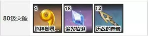 80级:鸣神御灵的勇武*4、偏光棱镜*18、历战的箭簇*12、摩拉*4.5万