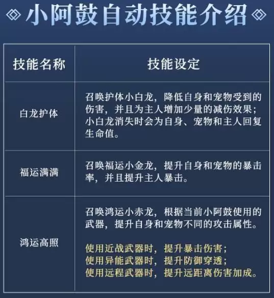 值得注意的是,小阿鼓只有在升阶到甲级以上后才会解锁以上这些战斗技能哦!而在升阶至双甲级之后,小阿鼓还会解锁手动技能盘龙(旅者需要通过轮盘手动释放该技能),释放平时积蓄的力量作为战前准备,在较长一段时间内提高主人和宠物的攻击力,只能在战斗外使用。