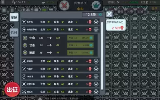 游戏界面最上方,战争旁边的红字是自己的战力,但由于不同兵种的生命-供给-速度并不一样,产生了不同的流派。理论上来说,在保证速度达到46即我方优先攻击的情况下,等战力的情况下,生命/攻击比例越低,那么兵种第一次输出可以秒的人越多,比如炮舰生命14.5k攻击1.35k,弩兵生命850攻击300,那么同样在先手的情况下,等战力的弩兵第一轮可以秒的敌人要远远多于炮舰。