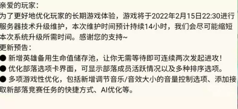 为了更好地维护大家的长期游戏体验,我们将于2022年2月15日22:25进行技术升级,本次技术升级时间预计14小时,我们会尽可能缩短本次系统升级所需时间,感谢您的理解和耐心等待!