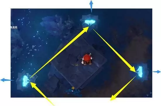 图中的蓝色箭头代表的是如果这里的镜子是水面镜,则光球到达此处并发生折射后的移动方向