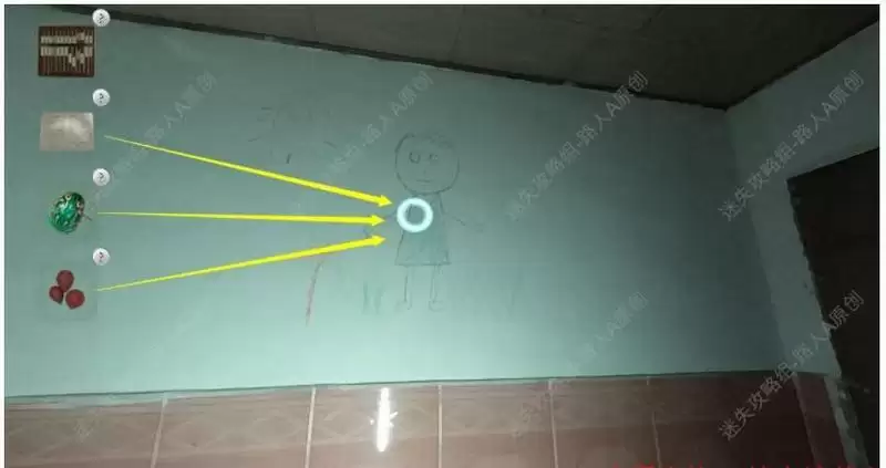 对墙上的涂鸦使用【试卷】、【玩具】和【气球】,涂鸦出现红色眼睛并且看向门边。