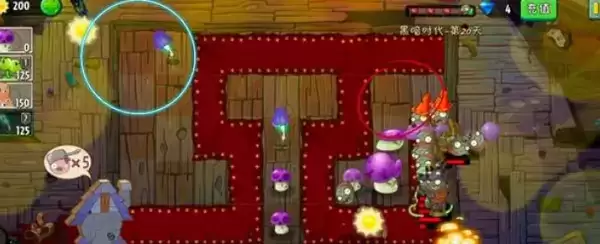 2.首先这个地图其实并不算复杂,我们只要注意两个出现僵尸的入口就可以了。由于两个位置都会出现僵尸,所以我们在进行防御的时候要双管齐下,在这张地图当中选定的植物4种,分别是小喷菇,大喷菇和激光豆以及双向射手,花生射手以及闪电芦苇。
