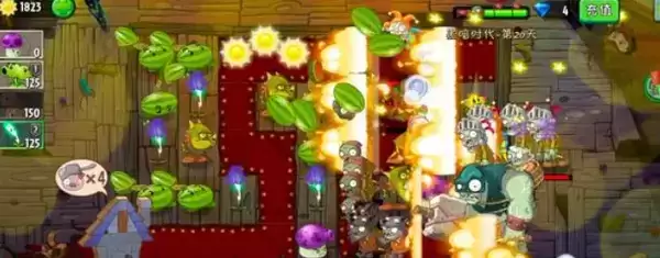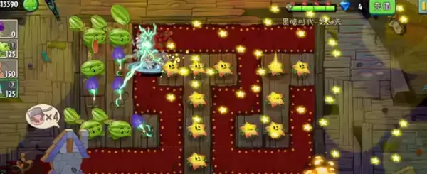 4.等到了中后期,我们等阳光积累足够之后,植物就需要进行改变,比如说最上面一路全部种上闪电芦苇,而且要升到二级变成西瓜投手。距离小筑最近的7格空地,建议种植闪电芦苇控制僵尸,一个红草可以出生三个范围。在后期就可以种植花生,射手直接升到三级变成星星果。