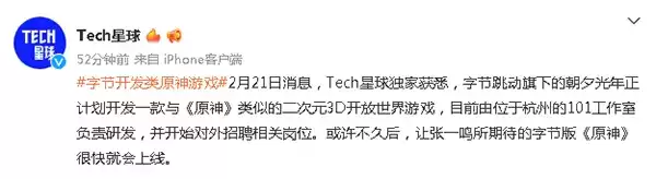 早前原神刚上线的时候有媒体也爆料了字节跳动的张一鸣在飞书中对员工讨论《原神》进行了一些不满,可能这也让字节跳动看到了这类型游戏的潜在市场。