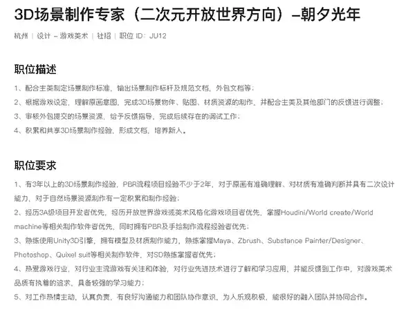 在朝夕光年的招聘岗位中我们可以看到目前正在招募3D场景制作专家,并且对于岗位有着一定的要求。除了之外还有其他5个岗位都是与二次元开放世界、大世界相关的,涉及3D场景制作、动作设计、角色扮演等多个方面。