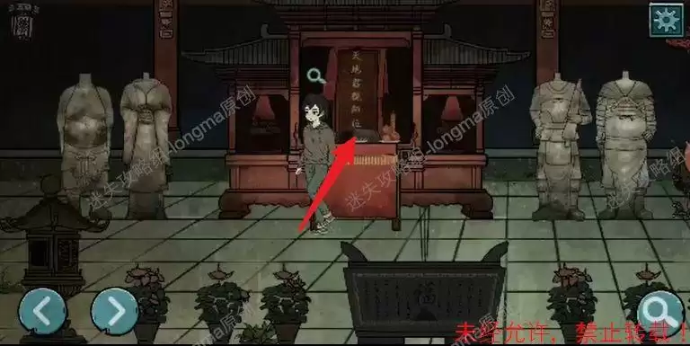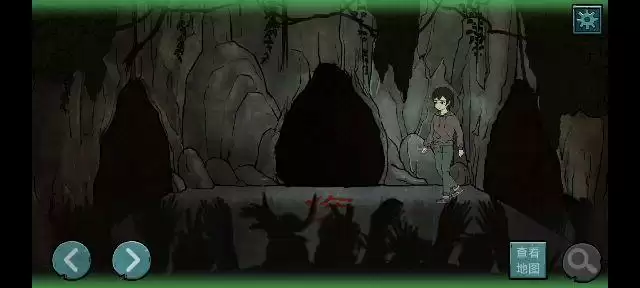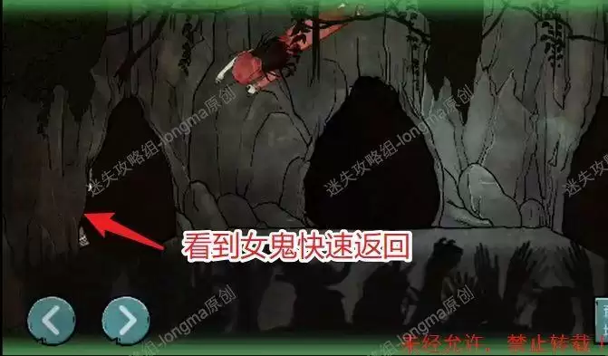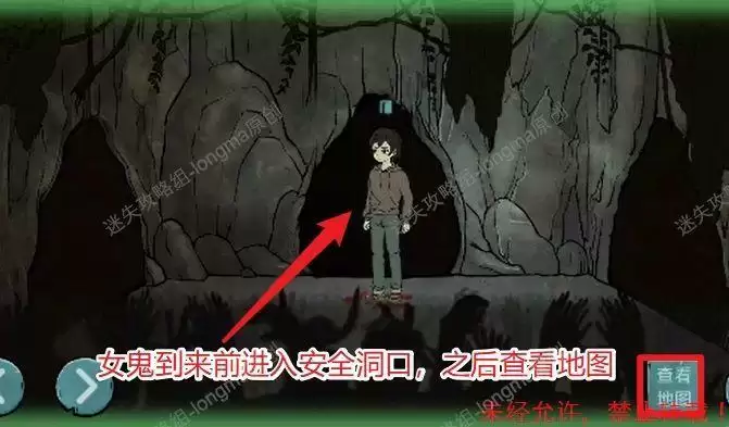 向右进入洞中完成小游戏(根据地图显示,画圈的地方有女鬼,进入女鬼地盘,然后快速的返回,可以将女鬼引到其他地方,注意:看到女鬼返回后需要快速的进入到下一个安全地带,女鬼会快速到来,安全后需时刻观察地图,找到正确路线),出去后第五章结束。