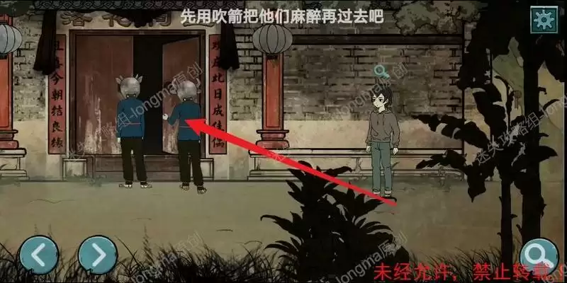 使用【吹箭】将【麻醉针】射向看守,看守倒下后,拾取两个头套。