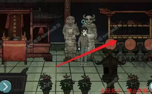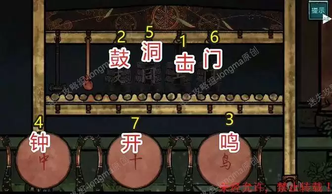 观察右边的编钟,对照神台下的第二句诗的偏旁,补全这些字,依次点击“击鼓鸣钟洞门开”,打开右边的门。