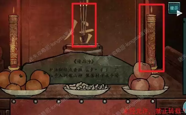 观察中间神台,点击右边蜡烛,在左边蜡烛上点燃后重新放上去,然后点燃三根【香】,插在香炉中。