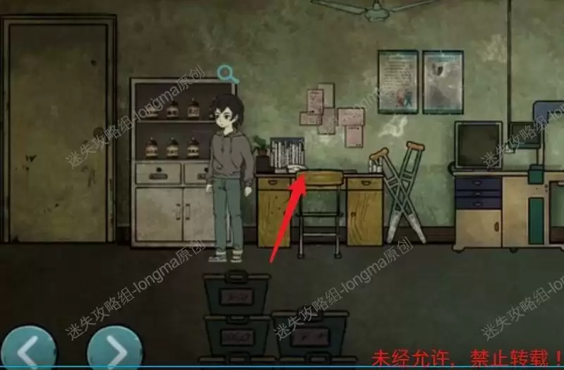 来到上面一层,向左来到桌子旁,观察桌子,拾取左边的【空滴管】。