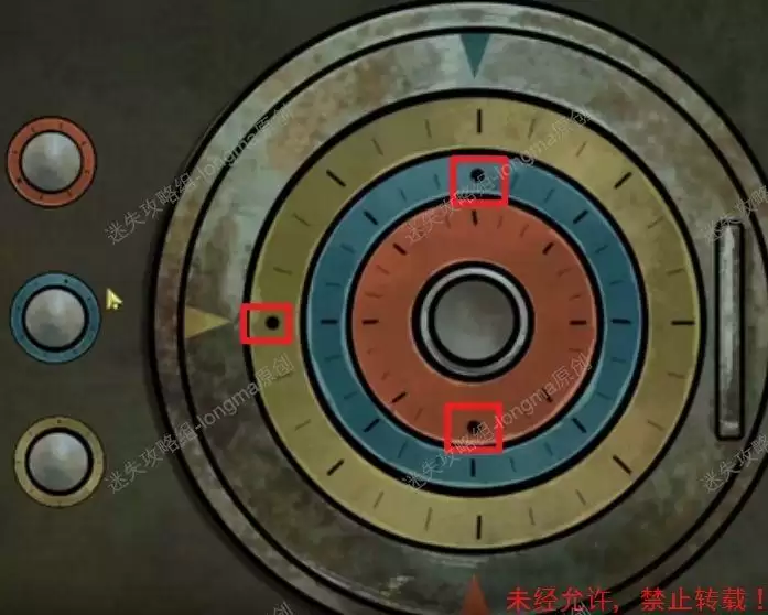 站在椅子上打开天花板上的机关,完成小游戏(点击左边按钮,使三个圈子的黑点对应同颜色的指针)。