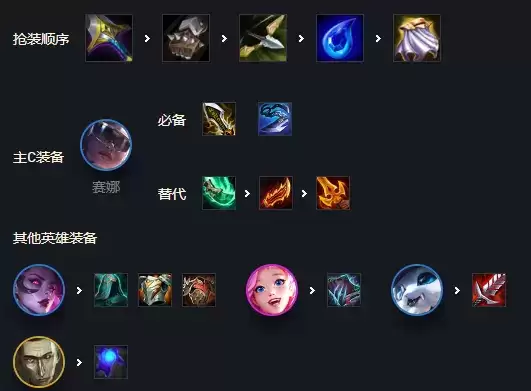 赛娜:装备给上无尽、巨杀、青龙刀备选羊刀、杀人剑