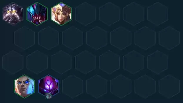 2、过渡推荐:卡萨丁+挖掘机+猪妹+乌鸦+蚂蚱组成3变异2格斗2黑魔2海克斯;