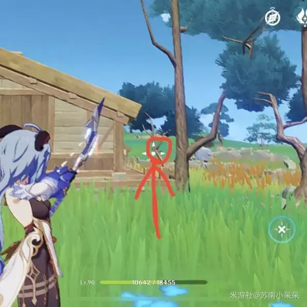 任务完成方法:站在原地,朝着图中圈出来的树的分叉口蓄力射击(无需蓄力满)连续射击,等到看到鸽子飞走了,过几秒会出现派蒙的提示对话,并提示事件已完成即可(完成后不需要角色走过去!)