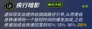 虚拟现实会提供给琪琪路径引导,从而使自身移速得到一个极短时间的爆发加成,之后移速加成会快速回落到10%/13%/16%/20%。