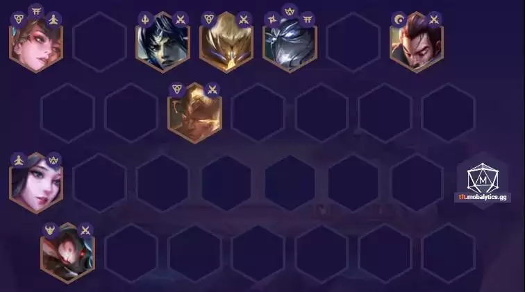 阵容推荐:刀妹(3)、赵信(3)、武器(2)、慎(4)、亚索(1)、盲僧(5)、风女(2)、卡莉斯塔(3)