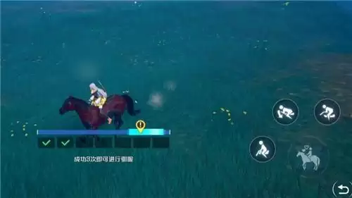 当屏幕中间的感叹号经过浅蓝色区域时,点击提示的发光按键,成功三次即可驯服野马。