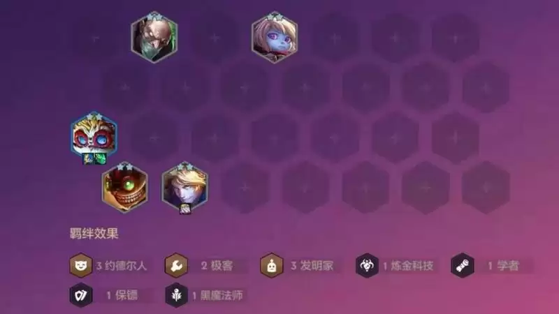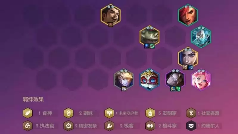 羁绊效果:1食神 2姐妹 1未来 5发明 1名流2执法官 2发条 2极客 2格斗