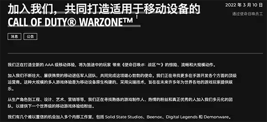 在3月10日时动视发布一条动态,正在招聘手游的研发人员,并且通过翻译能够确认正式正在开发“一款全新的,拥有3A级体验的手机游戏,将会把《使命召唤:战区》的惊险、流畅和大规模行动的体验带给玩家。”