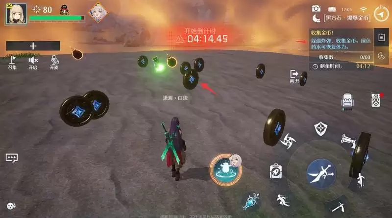 在有限的时间内快速收集金币(需要注意躲避炸弹,炸弹会眩晕,药瓶可以恢复体力)