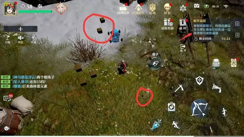 寻找周围的箱子搬放至两个箱子处周围即可通关