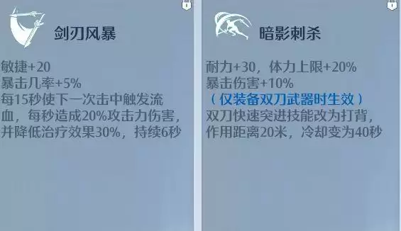 天赋在职业技能页没点到1200技能点时,推荐双刀天赋页的【剑刃风暴】【暗影刺杀】以增强输出能力,通用天赋页【厉战之躯】提升生存能力。