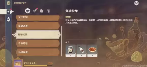 原神游戏中近期为玩家们带来了一个最新的“曲生酌微梦”的调制饮品的活动,玩家在这个活动中可以调制各种不同的饮品,其中焦糖松果是属于咖啡饮品,具有较好的口感,那么具体的原神焦糖松果配方是什么?那么具体的原神焦糖松果配方分享,一起来看看吧。