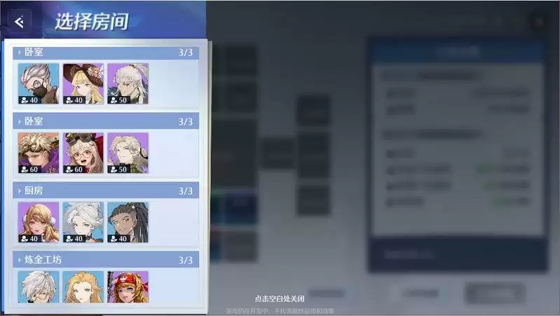 房间派驻:选择幻灵进入指定房间派驻,所选幻灵可每30分钟进行资金和食物产出。