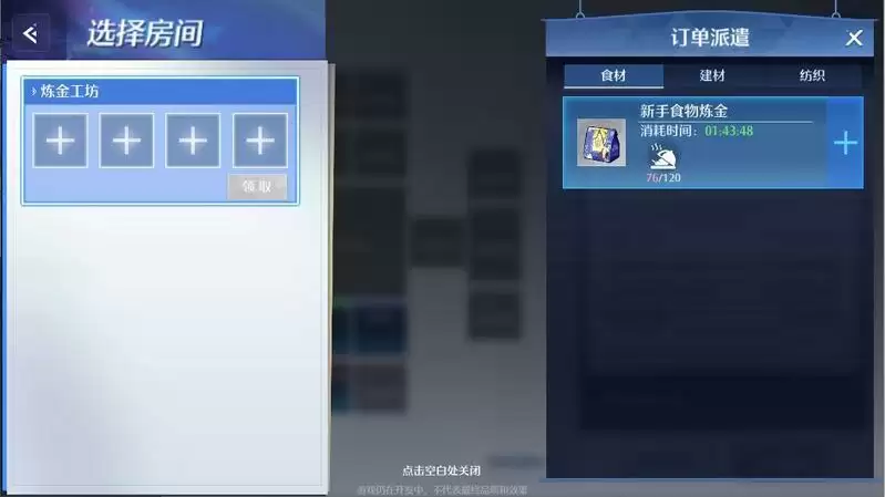 订单派驻:选择指定房间可对食材、建材、纺织等进行派驻,派驻结束后获取一定的生活积分和家园币。
