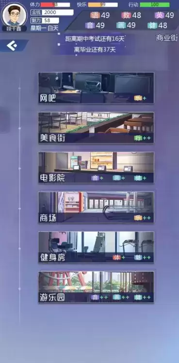3、在学校,你可以通过上课、自习、参加社团、图书馆阅读等活动提升自己的文化课数值。不同的场所提升的数值量不一样,在每个场景的右下角即可查看。当然你还可以逛公园,去网吧,直播,健身等等众多方式来提升数值。恋爱诚可贵,学业价更高——万一考试通不过,可是要被劝退处理的哟。