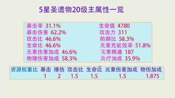 该权重比为暴击:爆伤:攻击百分比:生命值百分比:元素伤害加成:物伤加成=1:2:1.5:1.5:1.5:1.875;该权重比适用于圣遗物主属性、副属性、角色突破属性、武器副属性等各种情况,算是原神数值设定的一个守则。