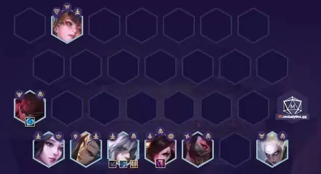 阵容推荐:刀妹(3)、派克(2)、风女(2)、莫甘娜(4)男刀(4)、卡特(3)、阿卡丽(2)、皎月(1)