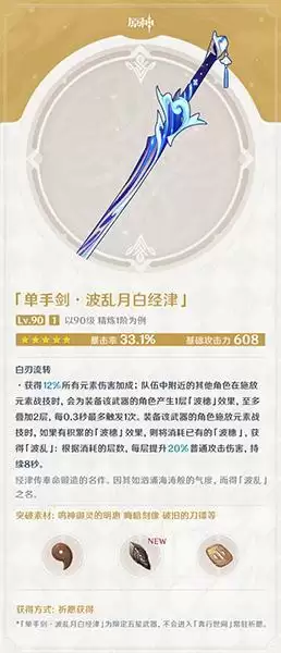获得方式:祈愿获得(限定五星武器,不会进入「奔行世间]常驻祈愿。)