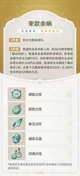 4件套:普通攻击命中敌人时,有36%概率触发「幽谷祝祀」:普通攻击造成的伤害提高,伤害提高值为攻击力的70%,该效果将在普通攻击造成伤害后的0.05秒后清除。普通攻击未触发「幽谷祝祀」时,会使下次触发概率提升20%;0.2秒内至多判定1次触发与否。