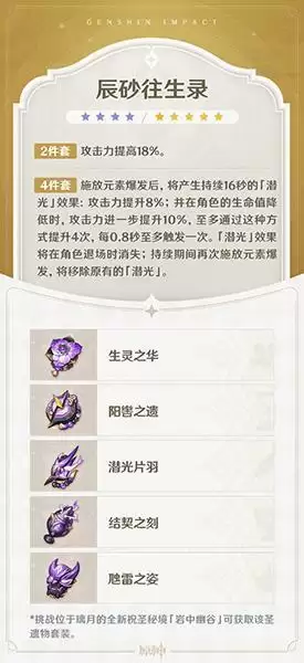 4件套施放元素爆发后,将产生持续16秒的厂潜光]效果:攻击力提升8%;并在角色的生命值降低时,攻击力进一步提升10%,至多通过这种方式提升4次,每0.8秒至多触发一次。「潜光」效果将在角色退场时消失;持续期间再次施放元素爆发,将移除原有的厂潜光」。
