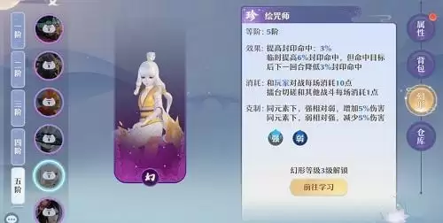4、五阶幻形符绘咒师和锦鲤仙子,绘咒师适合搭配长生或是合欢使用,可以临时提高封系的命中效果;锦鲤仙子则是南疆和天音的首选,不仅可以提高治疗强度,而且在自身复活后隐身一个回合,大大的提高了辅助门派的生存空间,无论是三输出队还是双奶队,都值得使用。
