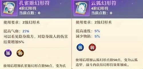 3、除了元素属性的加入,本次幻形符玩法的升级还加入了6张全新的幻形符。四阶幻形符孔雀姬和云狐,其中孔雀姬可以帮助玩家看见隐身单位,并且增加对隐身单位的伤害,可以配合输出职业用来对付隐攻宝宝;云狐则是提高5%的速度,减少5%的物防,可以搭配合欢等高速门派使用,但抢一速的同时需要注意生存空间。