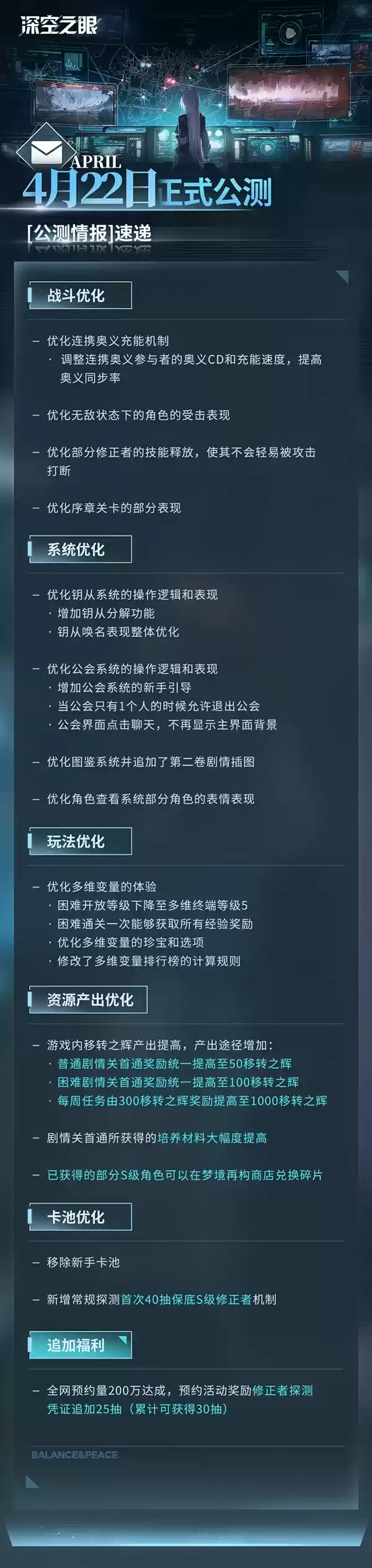 《深空之眼》游戏正式目前公布了游戏的上线时间,在4月20日将会全面开启游戏公测,目前游戏全网的预约人数达到了200万,在预约奖励上正式也是对预约奖励修正者探测凭证增加到了30抽,关于公测的相关调整以及注意事项一起来看下吧。