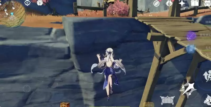 跳上来以后回头看,有一个树莓,山边有一个断桥,顺着这个断桥爬到上一层台阶。