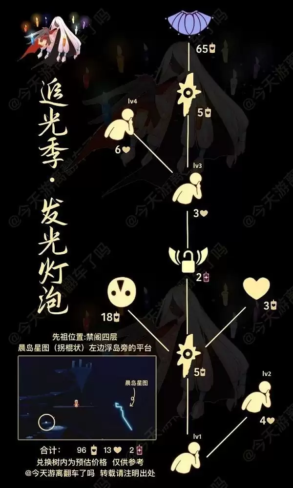 2、兑换三角额纹面具、幽蓝斗篷、噤声动作所需价格为2根红蜡烛、96根白蜡烛、13颗爱心,兑换树内为预估价格,仅供参考。