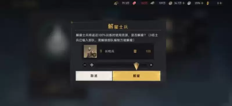 4、在对话框中,设置要解雇的士兵数量后点击【解雇】功能就好了