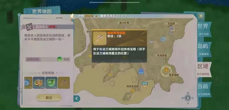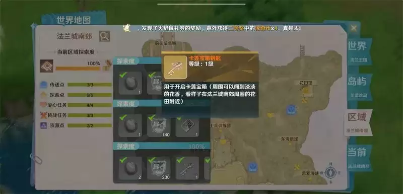 法兰城南郊地图全任务完成-探索度100%奖励-卡莲宝箱钥匙-卡莲宝箱-(地标:法兰城南郊147.41)