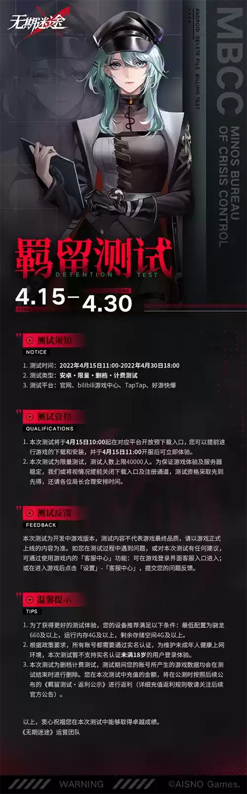1.本次测试将于4月15日10:00起在对应平台开放预下载入口,您可以提前进行游戏的下载和安装,并于4月15日11:00开服后可立即体验。2.本次测试为限量测试,测试人数上限40000人。为保证游戏体验及服务器稳定,我们或将视情况提前关闭下载入口及注册通道,测试资格采取先到先得,还请各位局长合理安排时间。
