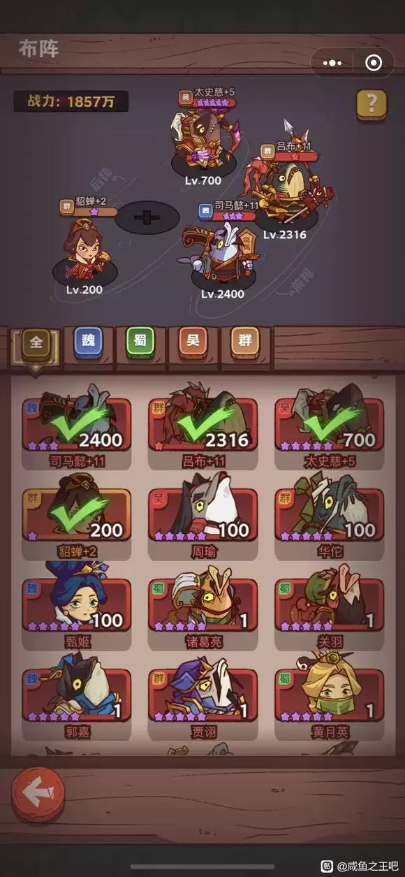 咸鱼之王新叠盾流派阵容怎么玩,下面这套阵容的核心就是叠盾+坦度+奶盾,五个武将都是平民烂大街的,分工明确到极致,盾叠起来根本打不动,就是平民的福音,不用氪稀有武将和鱼灵,全是标配卡