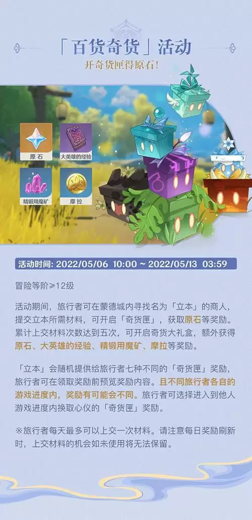 活动期间,旅行者可在蒙德城内寻找名为「立本」的商人,提交立本所需材料,可开启「奇货匣」,获取原石等奖励。累计上交材料次数达到五次,可开启奇货大礼盒,额外获得原石、大英雄的经验、精锻用魔矿、摩拉等奖励。
